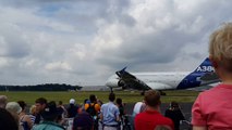 A380 departing from Farnborough after 2014 airshow... watch out for the gust and flying grass from the powerful thrust!
