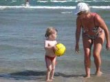Inès dans l'eau (assez froide) et sur une plage de galets !