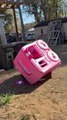 Girl Tries to Drive Toy Vehicle Down Stairs