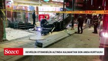 İş yerlerine çarpıp devrilen otomobilin altında kalmaktan son anda kurtuldu