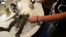 Rabbit gets pampered in the shower with Thai owner
