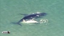 Köpek balığı ağına takılan balinanın annesi, yanından ayrılmadı