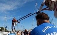 Le tout faisant un peu moins de 10kg, pas facile pour notre journaliste de conserver son équilibre une fois sur la tintaine. Dans les deux bateaux aux couleurs chatoyantes des équipes bleue et rouge, les jouteurs attendent leur tour. Parmi eux des jeunes, des moins jeunes, des garçons, des filles. Franck Mussou, le président du club des Francs Jouteurs accepte volontiers de faire découvrir ce sport estival aux plus curieux. Chaque combat voit s'affronter deux jouteurs, c'est ce que l'on appelle une passe chez les initiés, le vainqueur sera celui qui n'est pas tombé à l'eau.