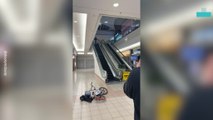 The footage, shot from a helmet-mounted camera, shows a man riding a Ducati thrown from his bike after rounding a corner and sliding across the middle of the road.