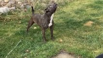 Bullmastiff drinking water out of the air in slow motion