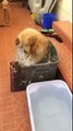 Really happy golden retriever taking a bath
