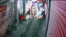 Cette jeune Chinoise marche dans la rue sans se douter que le sol va se dérober sous ses pieds et la faire tomber dans un trou !