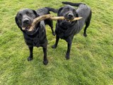 Two black labradors splashing around in a bath