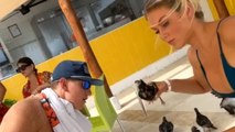 A woman feeds a flock of seagulls some chips. They anticipate the food and hover over her, anxious to see who gets it. One gets so excited that he poops on her. Instantly the woman laughs and turns to the camera, showing the stain on her chest. Gross out!