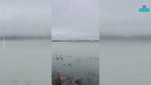 In the video, filmed on Sunday, the geese can be seen in the distance flying in a v-formation.