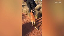 Baby kangaroo tries to climb into man's hoodie because it looks like a pouch