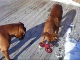 Dogs playing on the deck