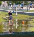 Jolie méthode pour récupérer son ballon dans une grande flaque d'eau sans mouiller