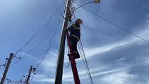 Bombeiro resgata gato preso em fios de poste de energia