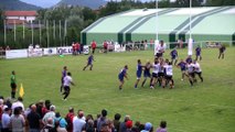 Nous sommes à la 22ème minute et sur un renvoi aux 22 mètres, l’ASBH va mettre l’USM au supplice. A la réception du ballon, les joueurs biterrois et montalbanais sont dépassés, en embuscade, le pilier héraultais Thimothé Lafon récupère la balle et sert Bakary Meïté lancé à hauteur des 40 mètres. Le puissant troisième ligne montre qu’il a aussi des cannes et dépose la défense adverse pour aller inscrire le troisième essai de Béziers en coin.