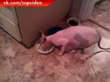 Пес ловит шарики в ведерко