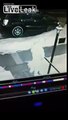 The man exits the car several pepper-ball barrages later. An officer who is off-screen tells him to put his hands in the air and walk backward away from the vehicle. Police fire another salvo of pepper balls when he appears to reach back into the car.