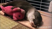 Bébé loutre accro à son ours en peluche