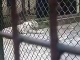 White huge TIGER busy eating meat inside the cave