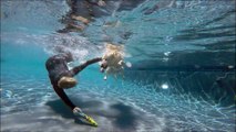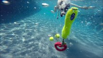 Labrador Retriever Keeper dives underwater with Mermaid Jana for her toypedo dog toy