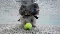 Shih Tzu Wookie dives underwater in beach entry for his kong tennis ball dog toy