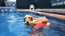 Golden Retrievers Campbell & Rusty swim underwater for dog toys then wear their post swim outfits