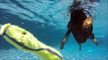 Golden Retrievers Campbell & Rusty swim underwater for dog toys