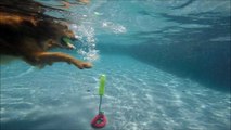Pit Bull Border Collie mix Coco dives underwater like a mermaid for her dog toys