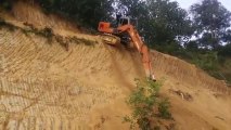 Un opérateur dans une pelleteuse va effectuer une opération délicate : descendre une paroi de plusieurs mètres avec son engin. Il va s'aider du godet pour faire appui puis se laisser glisser. La scène se passerait sur l'île de Bornéo en Malaisie, début mai.