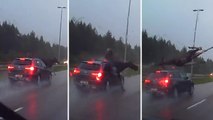 Au volant d'une Jeep cette homme conduisait à vive allure sur une route dans une zone rural, un élan va traverser la route, mais l’homme, qui avait le temps de le voir, va le percuter de plein fouet. La pauvre bête va voltiger dans les aires avant de venir s’écraser au sol. Heureusement que l’animal s'en sort assez bien par contre le véhicule aura besoin de quelques réparations…