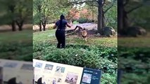Una mujer entra en el recinto de un león en el zoológico de Nueva York