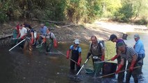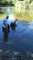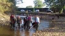 Après avoir attrapé les poissons à l'épuisette, ils sont transportés dans des bassines auprès du camion de la fédération de pêche de la Charente. Ils sont remis dans des épuisettes pour passer l'eau.