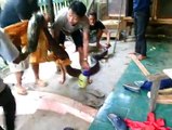 When they have prey in their sights, boa constrictors ambush hunt by striking unexpectedly with their teeth and quickly coiling their bodies around the trapped animal. As their name indicates, boa constrictors tighten their grip until their prey suffocates. Next, the snake unwraps itself and extends its jaws outward to swallow the entire carcass. Digestion muscles inside a boa constrictor's body contract rhythmically to push the food to the snake's stomach. While the snake's throat is blocked, an air tube in its mouth enables breathing.