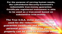 Laframboise-Security-Covenant (The Covenant) is a revocable living trust using the true United States Of America dollar the “True U.S.A. dollar” - money unit as defined in law as per the Coinage Act of the year 1792. The True U.S.A. dollar is expressed in definitive form and is a redeemable registered guarantee certificate for the purpose of serving human needs and social programs.