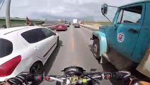 Sur une route à 3 voies, un motard slalome entre les véhicules et percute une camionnette de la DIR à l'arrêt qui signalait le début de travaux. La scène s'est passée à la sortie de Lille lundi 5 décembre 2016. Plusieurs camionnettes de la DIR Nord (Direction Interdépartementale Des Routes) avec une remorque-panneau étaient stationnées sur la voie de droite pour signaler des travaux. Mais un motard imprudent a cru bon de doubler un camion sur la voie du milieu par la droite, sans aucune visibilité. Pas de chance pour le motard, qu'il n'a pas eu le temps d'éviter la remorque-panneau. Il a percuté violemment la remorque et a chuté sur le sol. D'après la personne qui a filmé avec sa dashcam, le motard s'en est sorti. On peut le voir bouger en fin de vidéo. Ce media Un motard percute un véhicule de la DIR à l'arrêt (Lille) est apparu en premier sur Koreus.com.