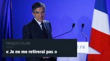 Alors qu'il sera convoqué le 15 mars afin d'être mis en examen dans l'affaire Fillon, le candidat de droite à la présidentielle ne se retire pour autant pas de la course à la présidentielle. "Je ne céderai pas, je ne me rendrai pas, je ne me retirerai pas", a-t-il assuré lors d'une déclaration à la presse ce mercredi midi. "J'irai jusqu'au bout, parce qu'au-delà de ma personne, c'est la démocratie qui est défiée", s'est justifié François Fillon.