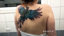 http://buzzfil.net Vous vous êtes une fois tatoué ? Si c’est Non. Après avoir visionné cette vidéo, vous allez mourir d’envie de vous tatouer. Comme celui que vient de réaliser André Zechmann, un artiste tatoueur autrichien. Il fait un tatouage mirobolant à une jeune dame : celui d’un phénix volant. Waouh, c’est FA-BU-LEUX… Quand la jeune femme hausse les épaule, vous avez l’impression que le phénix se met à voler. Car elle fait bouger les ailes de l’oiseau. Magnifique !!!