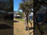 Un homme porte un magnifique costume d'arbre au Llano Earth Art Festival, une célébration de l'Art et la Nature organisée tous les ans à Llano, au Texas. Il déambule dans les allées du festival en étant debout sur des échasses et se maintenant en équilibre avec ses branches. Une sympathique rencontre filmée par Kelbe Schrank.