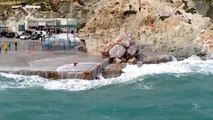 Des vagues géantes passent au dessus des immeubles en bord de plage