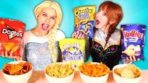 Frozen Elsa and Anna CHIPS CHALLENGE! w/ Spiderman Joker Snow White Spidergirl Fun In Real Life