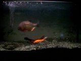 Piranha versus poisson rouge, je sais, ça peut paraître cruel, mais il lui faut des vitamines de temps à autre; là par contre, il a fait l'affamé!!! Il s'appelle "Patouch", il a 5 ans, 22 centimétres. Il avait sacrement faim le bougre!!! Peuchère!!!