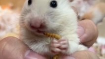 Tiny hamster holds tight to a bug before munching on it in this endearing clip