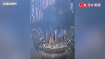 中邪還是作法? 台南宮廟綠衣男點香舞弄 失控暴砸打火機(翻攝畫面)