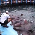 Man feeds sharks on aquarium platform