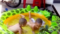 Hai anh em tắm bể bơi.