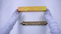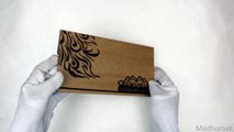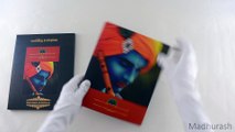 A colorful padded wedding card has a Indian traditional wedding theme with good looking foil printing and beads pasted on golden border. Its contain a decent inserts held with satin lace and box envelope with same theme. Its brilliant!
