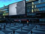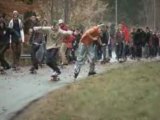Over 100 skaters merges down a tall hill, all united togheter and skating like one.