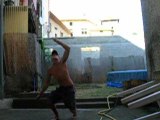 il jongle avec 2 staff et crache du feu en meme temps