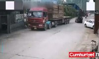 Korkunç an kamerada: İş makinesi otomobili biçti