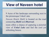 Naveen Hotels Hubli Spread over 9 acres of the landscape surrounding next to the picturesque Unkal Lake. We are Hubli's one of the best-recommended hotel for business and leisure stay. Classy ambiance, spacious rooms, Multi- cuisine's restaurant, open-air lawn for celebrations, and rejuvenating spa is what we offer to our guests when they visit us. For more Details please visit http://www.naveenhotels.com/